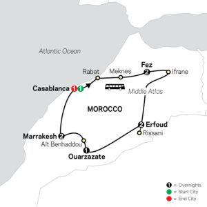 Our affordable tour of Morocco truly is a once-in-a-lifetime adventure. Exotic and fascinating, the Kingdom of Morocco is rich in history and culture, revealing intriguing historic sights, authentic cuisine, and changing scenery that is perfect for value-minded travel lover wanting to explore and learn about a new destination. This itinerary takes in the Imperial cities of Morocco, such as Fez, Marrakech, Meknes, and Rabat, as well as inspiring cities, like Ouarzazate, Casablanca and Erfoud. In the red city of Marrakesh, step back in time as you wander through the Jemaa-el-Fna, the main square and exotic bazaar, offering some of the greatest open-air entertainment. Listen to the storytellers—an integral part of the culture—and browse for handicrafts. In Fez, take an optional tour to visit the ancient medina. Founded in the 9th century, it is one of the largest medieval cities in the world and now a UNESCO World Heritage Site. On this comprehensive and affordable tour of Morocco, you will also be enchanted by beautiful oasis, stunned by the beauty of the desert, and surprised by the mountain scenery of the Middle Atlas. You’ll also visit Casablanca and see its modern great Mosque and Meknes, where you’ll visit the royal stables built to once house 12,000 royal horses. Your tour also takes you to Ouarzazate, where you’ll visit the Kasbah de Taourirt, and the amazing, fortified city of Ait Benhaddou, used as set to the “Gladiator” movie. Stop at the mountain resort of Ifrane; overnight in Erfoud, the gateway to the Sahara Desert, and visit Rabat, Morocco’s vibrant capital. Walk around the relics of Chellah, a city built by the Romans in 40 AD. From the Middle Atlas mountain range and Ziz Gorges to arid desert, this budget-minded Morocco vacation will amaze you with spectacular scenery.