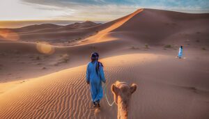 Enjoy a full buffet breakfast at your hotel. Depart through the gentle mountains of the Middle Atlas. Continue by a beautiful route of Berber life. Arrival in Erfoud at the limits of the great Sahara Desert. Change of transport from the bus to the 4 x 4 vehicles to cross the desert to the dunes where our camp is located. Arrive at your luxury Desert Camp for a night among the Dunes. (BD)