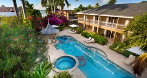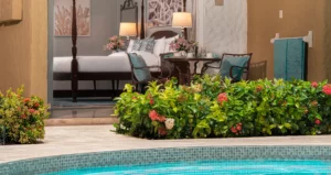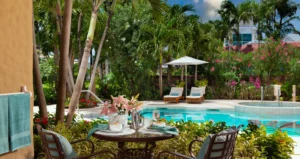 Located on the ground floor of the Flamboyant and Oleander buildings, this spacious room features a private patio that opens directly onto a quiet cottage pool surrounded by beautifully landscaped gardens. The room features a four-poster, king-size bed, flat screen TV, and an en-suite bathroom with a bathtub/shower combination. For your refreshment, your room includes Robert Mondavi varietal wines and a refrigerator stocked with bottled water, juice, soda and local beer.