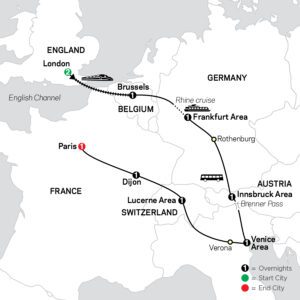 If you want to see Western Europe’s main highlights but don’t have much time, this European tour is the vacation for you! Visit England, Belgium, Germany, Austria, Italy, Switzerland, and France and see London, Brussels, Innsbruck, Venice, Lucerne, Dijon, and Paris. After spending some time in London, you’ll travel to Brussels on the Eurostar train, the easiest way to connect the two European cities. You will then carry on by tour coach through Germany to medieval Rothenburg, a walled town that has retained its fascinating character. Relax and take in the wonderful views of castle-crested hills, terraced vineyards, and pretty wine towns on the included scenic cruise along the Rhine River. Take a boat ride in Venice along the Giudecca Canal to St. Mark’s Square, allowing you to admire some of the palazzos and maze of streets. While in Venice, take the opportunity to watch glassblowers create their works as they have done for centuries. Some other must-sees on this iconic Europe tour are romantic Verona, the Italian city made famous by Romeo and Juliet; Lucerne, one of Switzerland’s finest cities, situated on the shores of breathtaking Lake Lucerne and nestled within the snow-capped Swiss Alps. Last, but not least, visit Paris, capital of France and one of the most celebrated cities on the old Continent. Here, your tour guide will show you some of the most famous sights in Paris—including the Arc de Triomphe and Eiffel Tower—on the city sightseeing tour. In a short time, this affordable European tour offers it all—historic sights, big cities, quaint towns, and scenic beauty.
