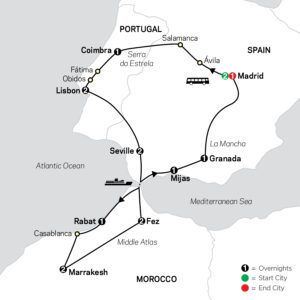 On our Spain, Portugal, and Morocco tour, experience the rich history and distinct cultures of these three glorious countries. You’ll overnight in Madrid, Seville, Granada, and the Costa del Sol in Spain; Coimbra and Lisbon in Portugal; and Rabat, Marrakesh, and Fez in Morocco. The tour starts in Madrid, where you’ll discover the main sights with a local guide. On the way to Portugal, visit Avila, a UNESCO World Heritage Site, with its ancient, fortified towers and walls, and beautiful Salamanca. The Portuguese pearls you’ll discover on this affordable tour are Coimbra, Obidos, Fatima with its famous Sanctuary, and the capital, Lisbon. Cross the Strait of Gibraltar to Morocco on the African continent by ferry to step back in time in Rabat, a UNESCO World Heritage Site and Morocco’s capital. Fez is still the cultural and spiritual hub, and its centerpiece is the Medina, a UNESCO World Heritage Site. Its exotic palaces, madrasas, fondouks, residences, mosques, and fountains date back to the 13th-14th centuries. The red city of Marrakesh remains a tapestry of ramparts, mosques, palaces, gardens, vibrant public squares, and souks (markets). You’ll get to know this fascinating city with a local expert on the included sightseeing tour. Stop in Casablanca, Morocco’s westernmost city. Its name still resonates because of the 1942 classic film with Humphrey Bogart and Ingrid Bergman. Once back on the European continent, you will love the included guided visit to Granada’s legendary Alhambra complex*, a lavish palace and fortress built by Moorish kings in 889 AD, and you will appreciate it even more after having visited Morocco. These are just some of the many highlights on this comprehensive and affordable Spain, Portugal, and Morocco tour. It’s a memorable budget vacation for value-minded travel lovers.